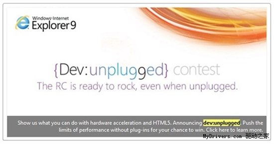 從圖中的信息可以知道,這是微軟即將舉辦的一次競賽活動,鼓勵開發(fā)人員為IE9 RC開發(fā)一些不需要插件(plugin)就可以實(shí)現(xiàn)的功能。這里并沒有提及該競賽的獎勵或是開始、截止日期。不過相信微軟會很快宣布這個活動,畢竟這是為IE9 RC準(zhǔn)備的,而不是正式版。