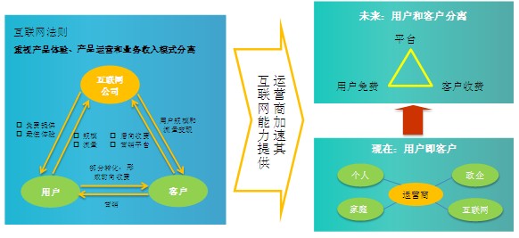 成都 做網站 —作為產業鏈密不可分的上下游,電信運營商可以向互聯網SP學習成功的互聯網經驗。互聯網服務提供商重視產品體驗,采用產品運營和業務收入分離的模式。互聯網公司將營銷對象分成兩類群體:用戶和客戶。首先通過免費提供、改善體驗的方式獲得海量的用戶群,如騰訊QQ目前高達8.18億的月度活躍用戶數;緊接著,基于龐大的免費用戶群,吸引廣告商、增值業務提供商、APP開發者,進行后向收費,實現用戶規模和流量的變現;同時通過差異化的服務來實現“免費用戶”向“付費客戶”的轉化,進一步增加收入,形成良性的商業運營模式。如圖所示。