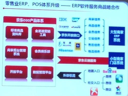 簽約萬家便利店的同時,京東和ERP軟件服務商SAP、IBM、海鼎、富基融通、宏業、海星、長益等也簽訂戰略合作協議,共同實現零售業ERP系統和京東平臺對接,升級零售業ERP系統,滿足門店庫存全渠道銷售所需和所有交易環節、結算環節、物流服務環節、售后客服環節的可視化,支持京東電子會員卡和手機支付功能。
