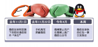 繼今年4月之后,25日晚,阿里入股的新浪微博再次對(duì)微信進(jìn)行封殺,禁止用戶利用微博推廣微信公眾賬號(hào),到期沒有清除微信公眾號(hào)推廣的賬戶將可能面臨封號(hào)。這令外界聯(lián)想到日前曝出的微信封殺阿里旗下快的打車紅包一事。