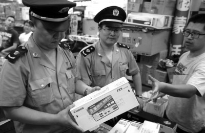 當天下午,根據商標權利人的舉報,海淀工商分局出動數十名執法人員,對中關村電子市場的電腦、電腦配件、相機配件、復印機耗材、版紙等產品進行突擊檢查。在科貿電子城3層的一個商鋪,執法人員發現大量假冒名牌辦公耗材,打假人員初步鑒定為侵權產品。而在該電子城4層的一家商鋪,執法人員發現,商戶的辦公耗材從外包裝和外表看,像真的,但是打開發現,里面的商標明顯與真品不一樣。此外,執法人員還發現大量空的佳能包裝盒。
