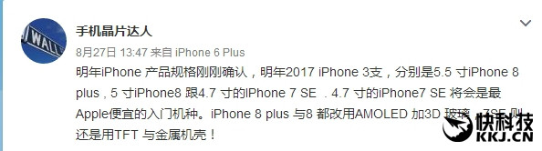 此外,消息人士還強調(diào),2017年的iPhone將有三款,一個是5.5寸的iPhone 8 Plus,一個是5寸iPhone 8,至于4.7寸的iPhone SE將成為蘋果便宜的入門機型,其會使用TFT材質(zhì)屏幕和金屬外殼,而iPhone 8系列將是AMOLED屏幕,機身為雙面3D玻璃。